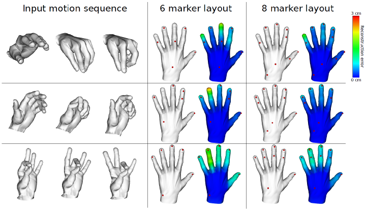 Subspace representations of hand articulations allow for the reconstruction of hand motions from sparse sensor data. Conversely, they can also be used to infer the minimal amount of input data necessary for robust hand posture reconstruction in the context of optical motion capture (Schröder et al., 2015). We addressed the problem of determining the optimal placement of a reduced number of markers in order to facilitate accurate posture reconstruction from sparse mocap marker data in a method that automatically generates functional layouts by optimizing for their numerical stability and geometric feasibility (Figure 4).