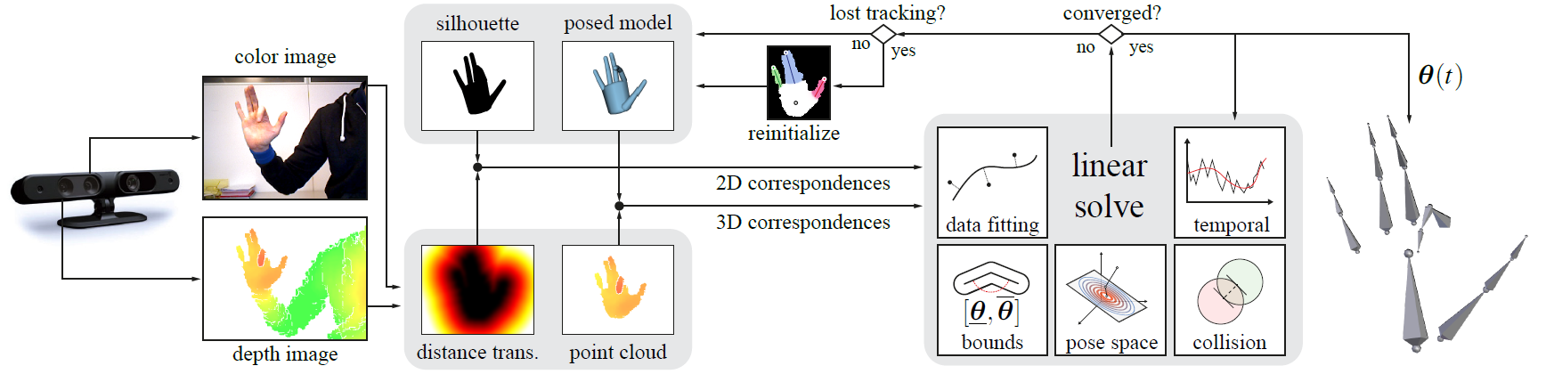 Figure 2: For each acquired frame a 3D point cloud of the hand and the 2D distance transform of its silhouette is extracted. From these point correspondences are computed to align a cylinder model of the hand to best match the data. This registration is performed in an ICP-like optimization that incorporates a number of regularizing priors to ensure accurate and robust tracking.