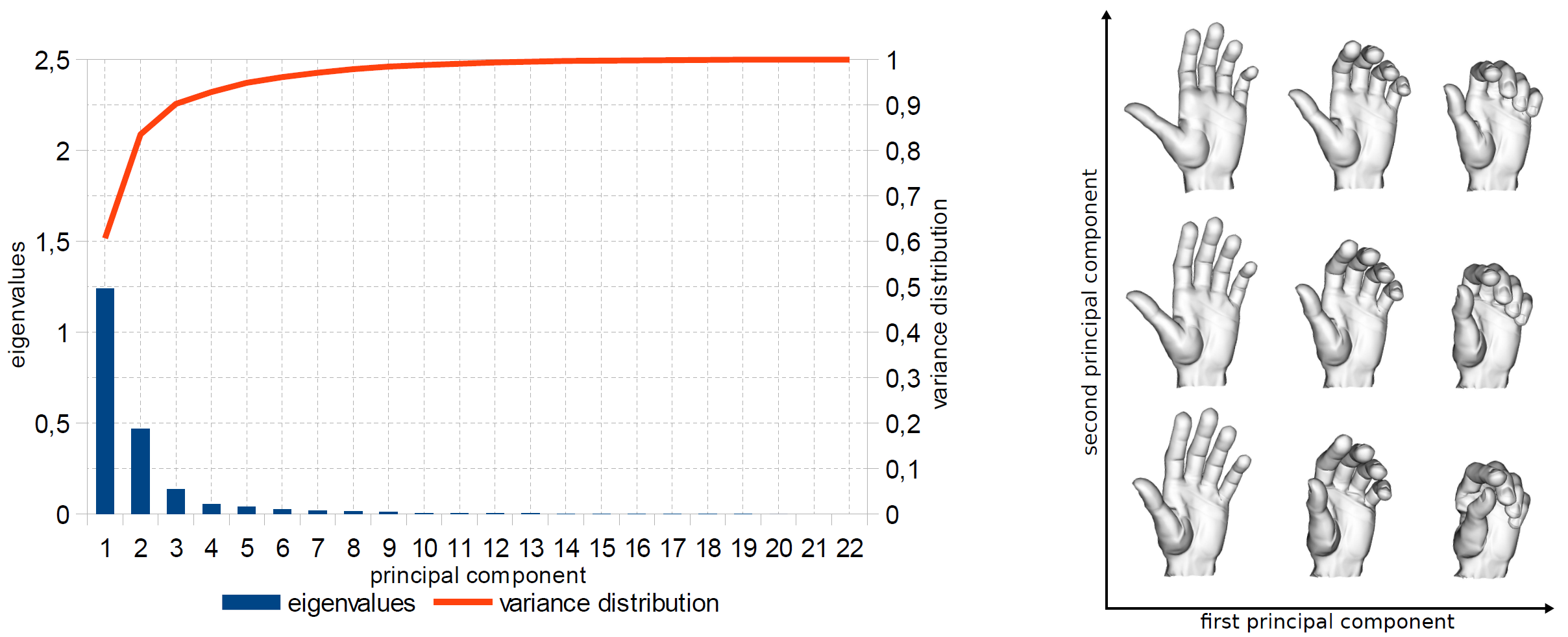 Figure 3: PCA of motion captured hand movements. Left: eigenvalues and variance distribution among the principal components of a grasping motion data set. The 3 most significant principal components already cover approximately 90% of the data variance. Right: visualization of the degrees of freedom represented by the first and second most significant principal components, which cover about 83% of the data variance and can be used to represent meaningful hand articulations in only two dimensions.