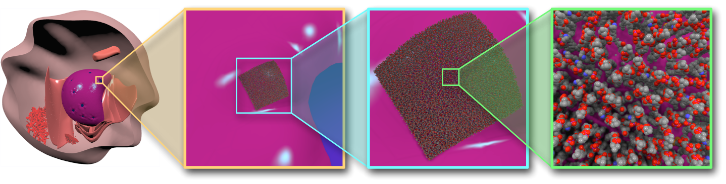 The point-based rendering metaphor, where elliptical splats are generated from simple OpenGL points, has also been successfully applied in scientific visualization. For instance, in molecular visualization, individual atoms and their connections can be represented by sphere and cylinders, respectively, which are generated and rasterized completely on the GPU (Sigg et al., 2006). Thanks to the high rendering performance, even dynamic (pre-computed) MD simulations of large membrane patches can be visualized in realtime, which we exploited for an interactive “atom-level magnifier tool” in a combined mesoscopic and molecular visualization (missing reference)